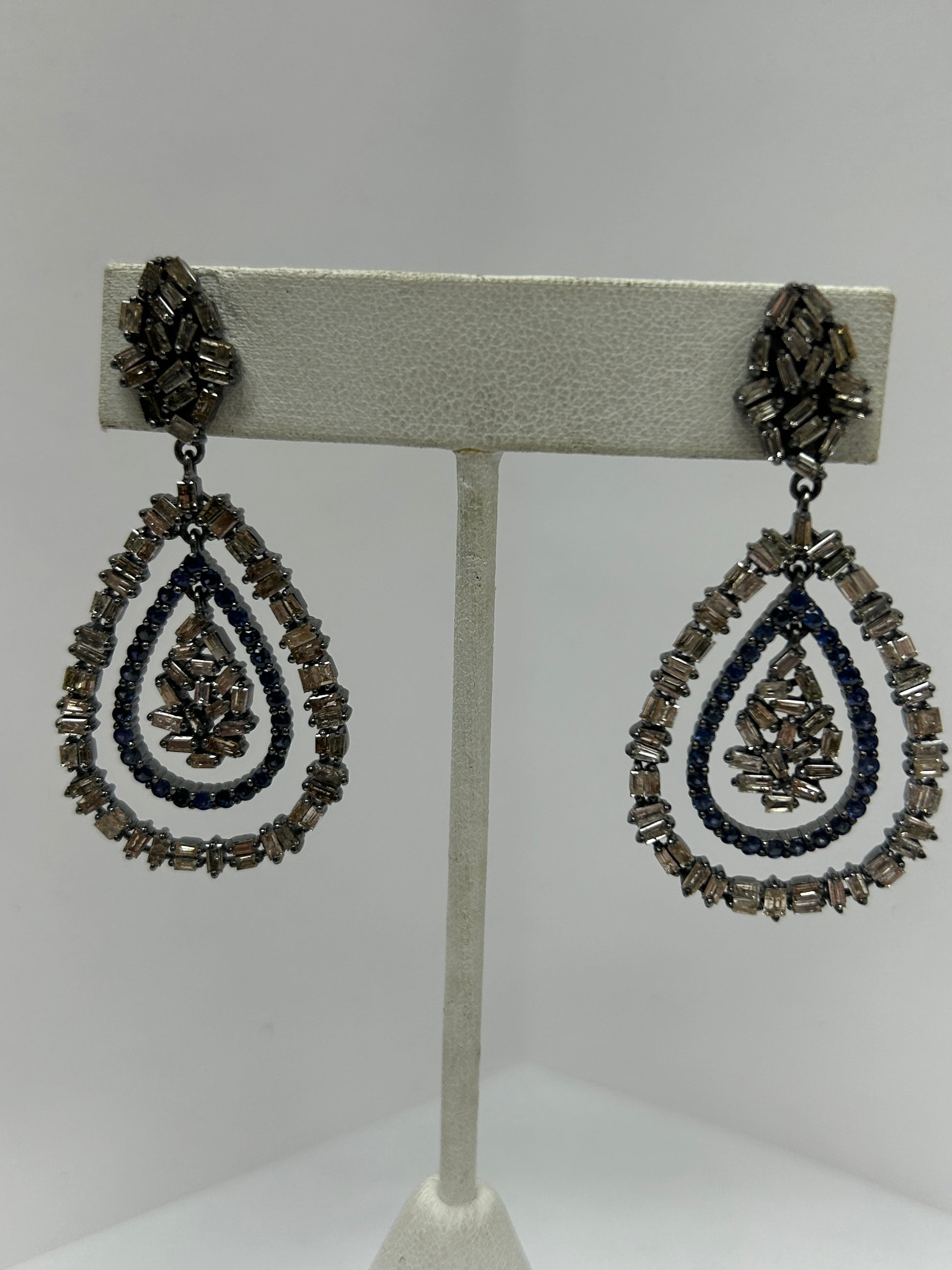 Double Drop Shape Diamond and Blue Sapphire Earring