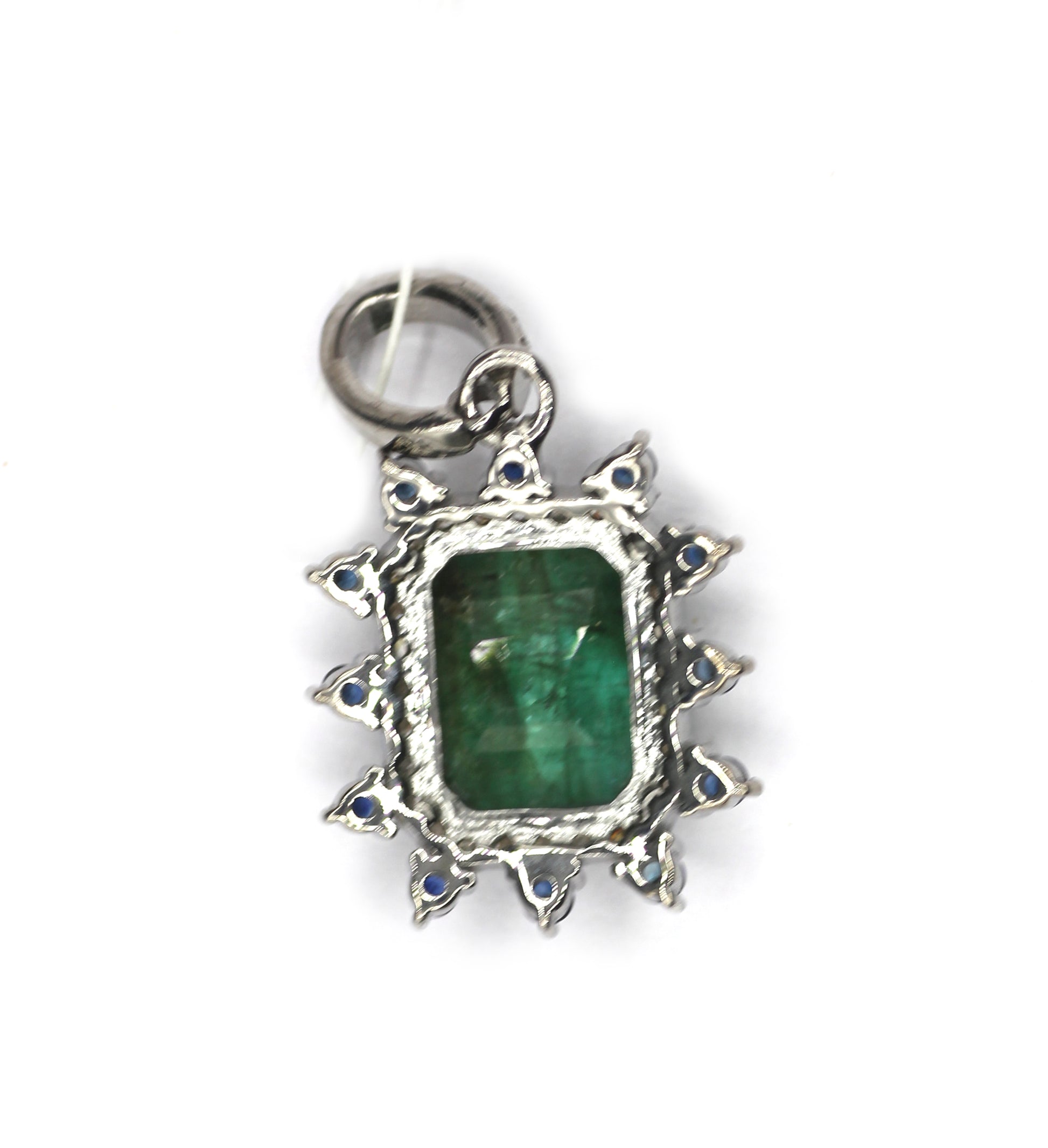 Emerald rectangle pendant in 925 silver with pave diamonds and blue accent stones, 20x18 mm