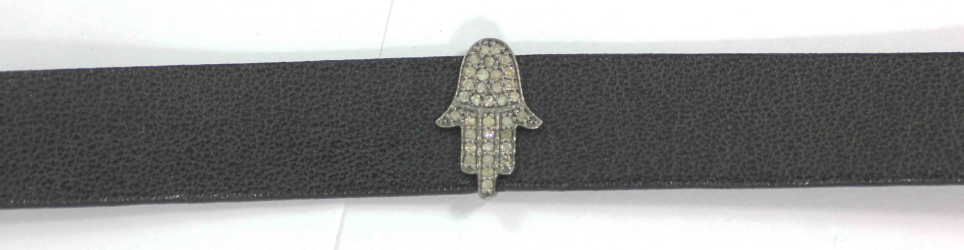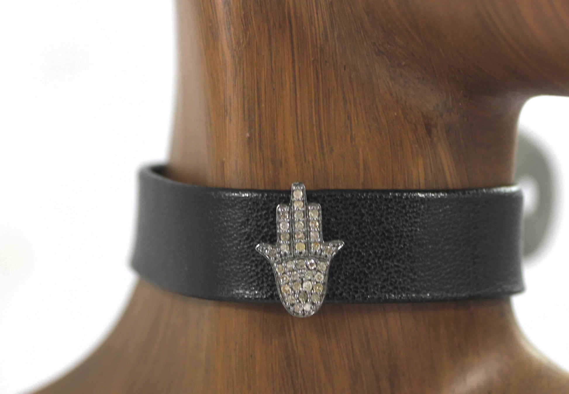 Hamsa Hand Shape Leather Choker Necklaces With Pave Diamond. 925 Oxidized Sterling Silver Diamond necklaces, Genuine handmade pave diamond necklaces.