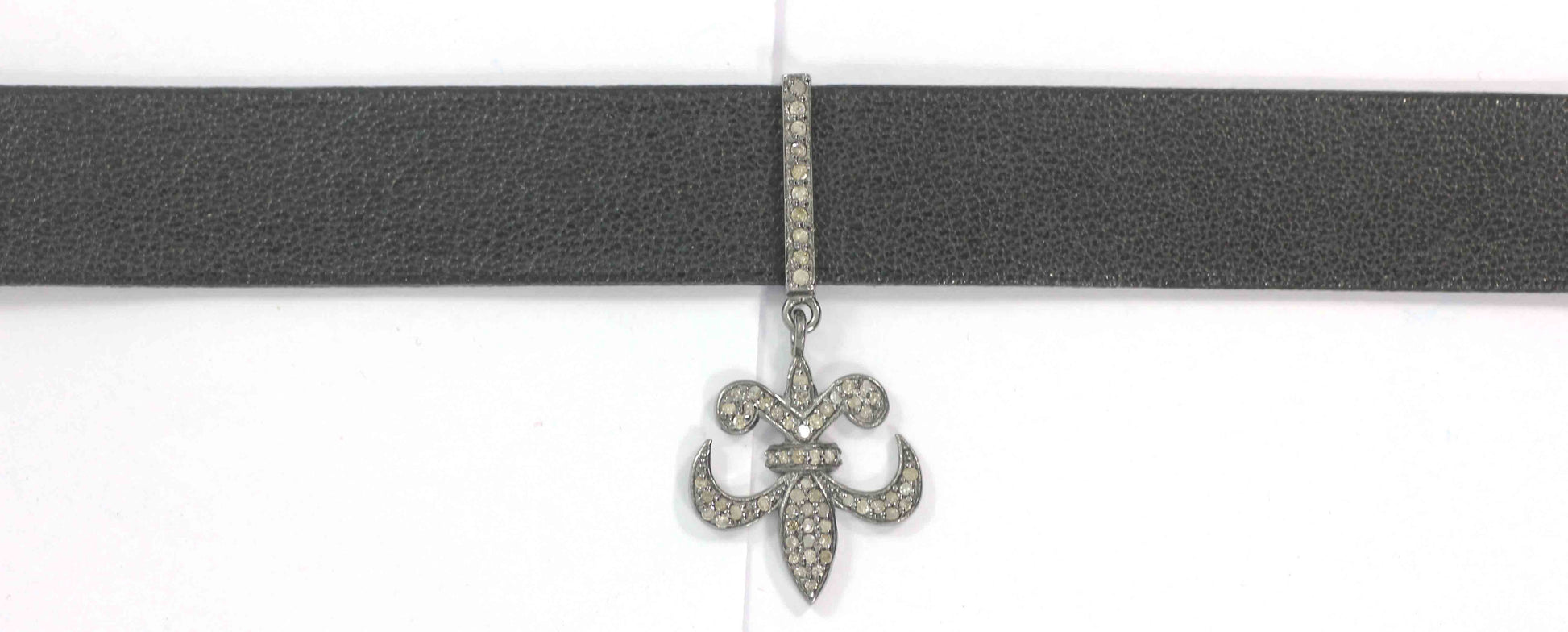 Fleur Di Lis Shape Leather Choker Necklaces With Pave Diamond. 925 Oxidized Sterling Silver Diamond necklaces, Genuine handmade pave diamond necklaces.